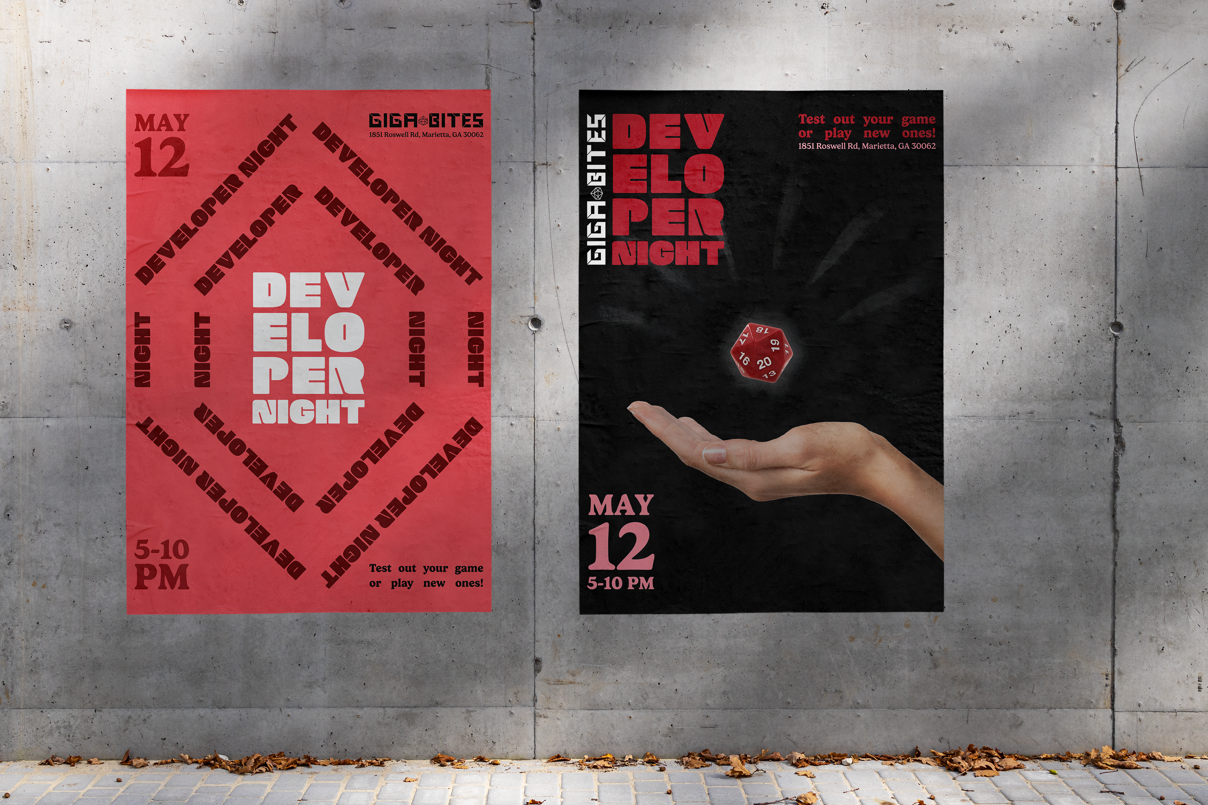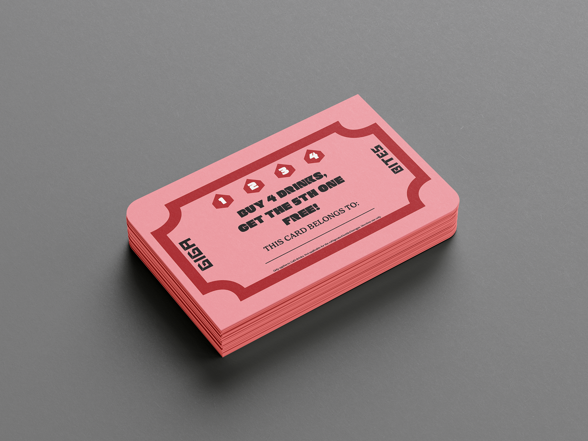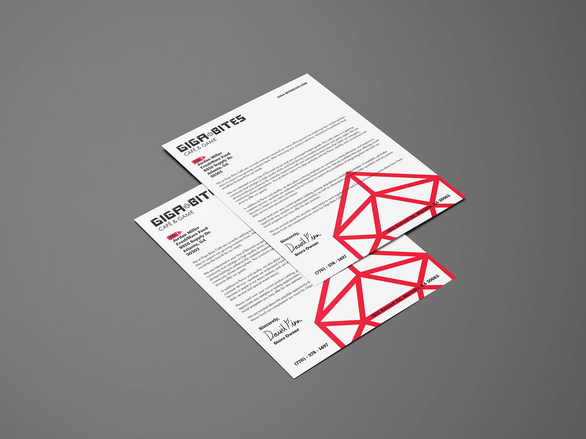 ↑In my Typography II class, I rebranded a local business, Giga-Bites Café, a gaming-focused café, and developed a full set of branding materials using InDesign, Illustrator, and Photoshop. Giga-Bites is a community space for gamers, offering tabletop games. The brand targets gamers, primarily men ages 20 to 50. For the logo, I incorporated dice and a castle to reflect fantasy gaming themes, along with a custom blocky typeface inspired by cards and board games. I built on the café’s existing red branding and added pink to create a more playful and inviting palette.