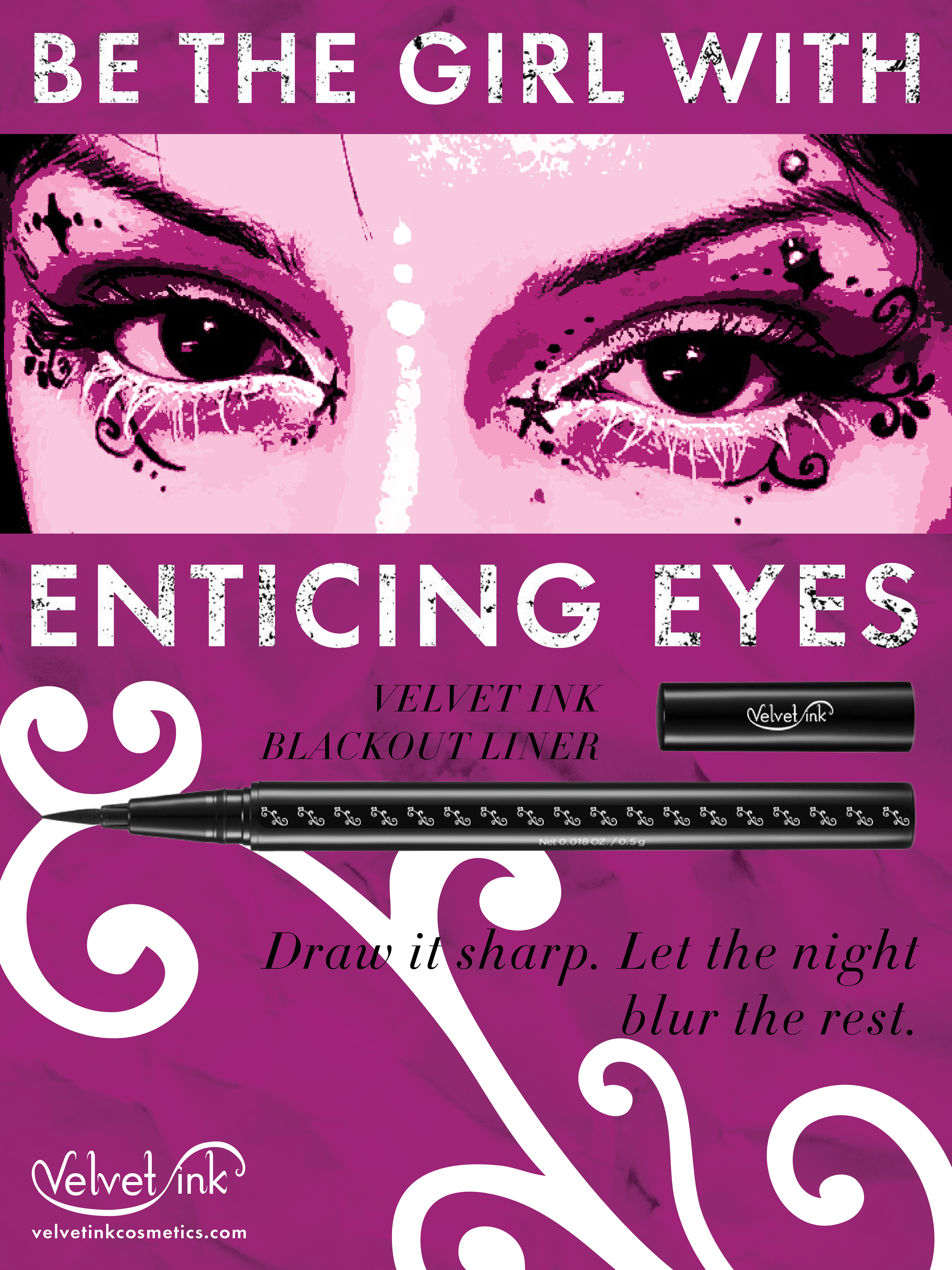 ↑For my Senior Portfolio class, I developed a makeup brand from the ground up called Velvet Ink. The brand targets women ages 21 to 30 who are creative, expressive, and drawn to nightlife, music, and club culture. Velvet Ink encourages users to move away from the “clean girl” aesthetic and embrace bold, experimental makeup looks. The tagline, “for girls who aren’t afraid to ink outside the lines,” reflects the brand’s mission to make makeup fun and creative again. The visual identity centers on bold, organic swirls, creating a dynamic and expressive aesthetic. I designed the full brand system, including the logo, eyeshadow packaging, brush packaging, eyeliner packaging, a thank-you card, and a promotional flyer. This project allowed me to explore branding at a deeper level, ensuring consistency across multiple touchpoints while building a strong and cohesive visual identity.